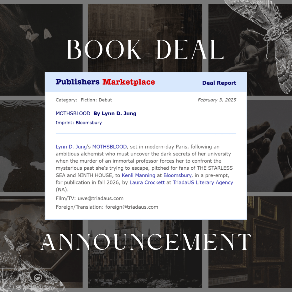 The announcement on Publisher’s Marketplace, which reads: “Lynn D. Jung’s MOTHSBLOOD, set in modern-day Paris, following an ambitious alchemist who must uncover the dark secrets of her university when the murder of an immortal professor forces her to confront the mysterious past she’s trying to escape, pitched for fans of THE STARLESS SEA and NINTH HOUSE, to Kenli Manning at Bloomsbury, in a pre-empt, for publication in fall 2026, by Laura Crockett at TriadaUS Literary Agency (NA).”